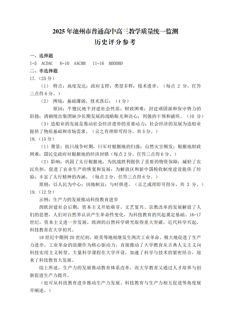 安徽省池州市2024-2025学年下学期3月高三二模监测历史答案