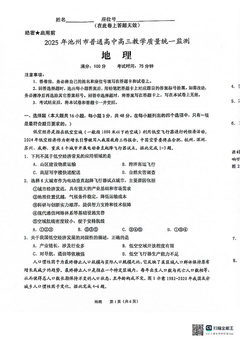 安徽省池州市2024-2025学年下学期3月高三二模监测地理