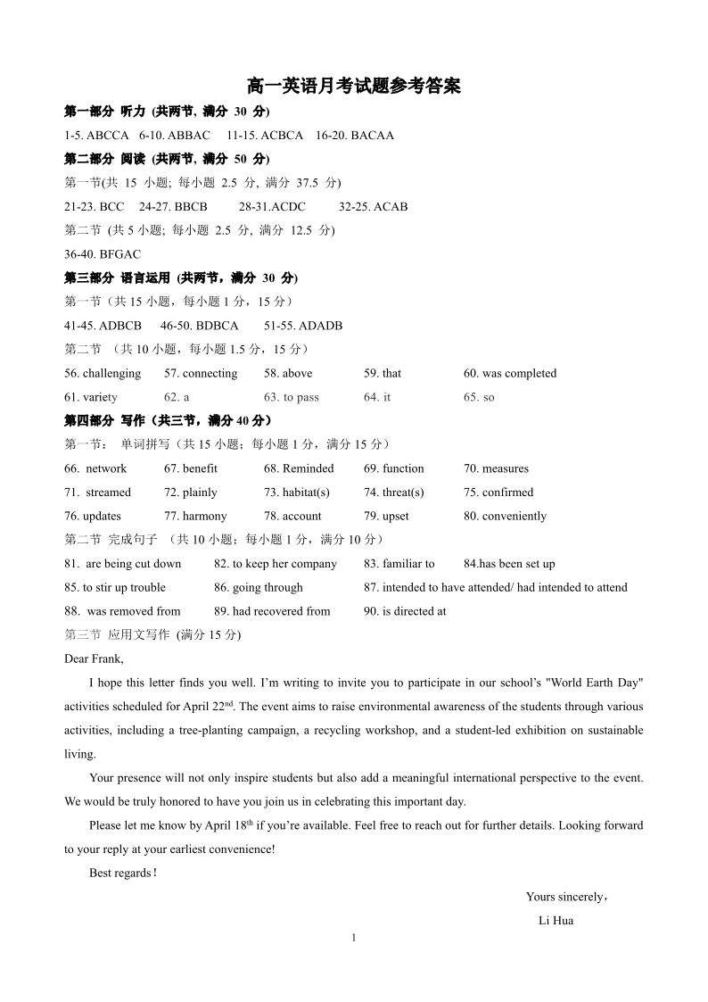 重庆市巴蜀中学2024-2025学年下学期3月高一月考英语答案
