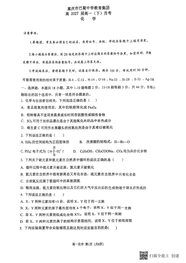 重庆市巴蜀中学2024-2025学年下学期3月高一月考化学