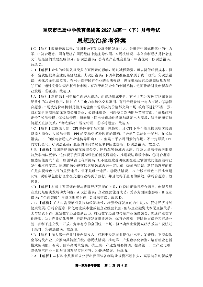 重庆市巴蜀中学2024-2025学年下学期3月高一月考政治答案