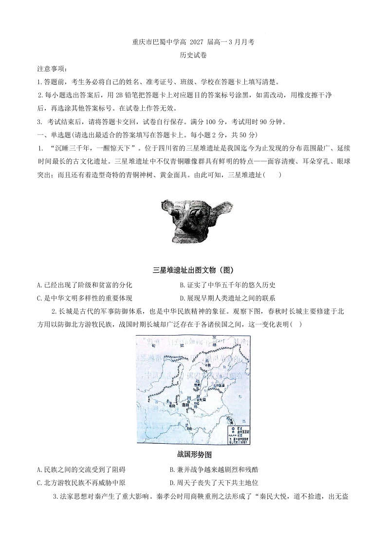 重庆市巴蜀中学2024-2025学年下学期3月高一月考历史