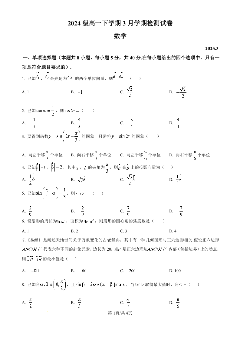 江苏省南京、镇江、徐州三市联盟校2024-2025学年下学期3月高一月考数学(原卷版)