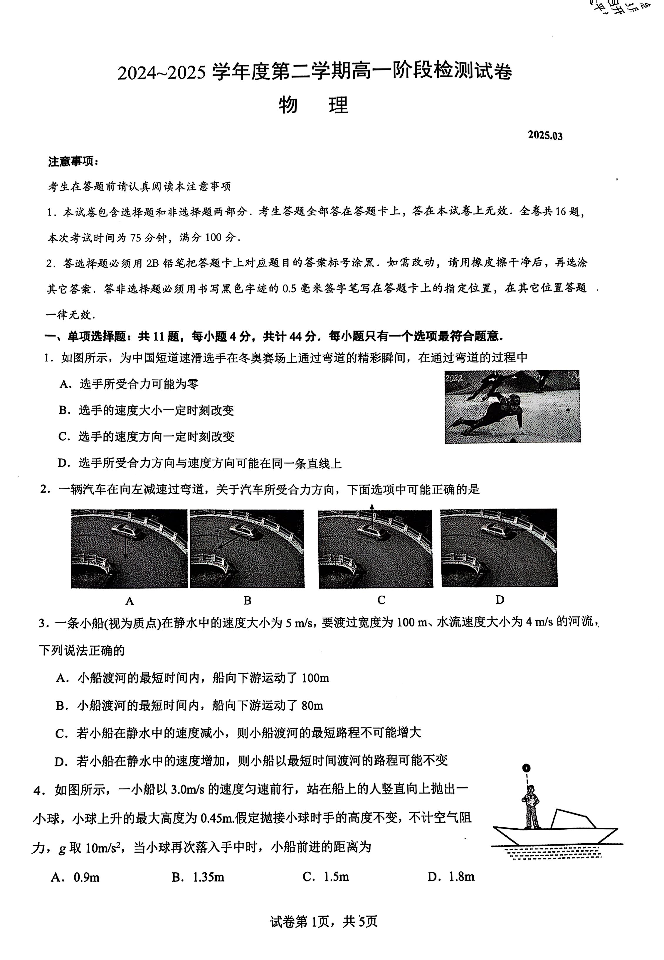 江苏省南京、镇江、徐州三市联盟校2024-2025学年下学期3月高一月考物理