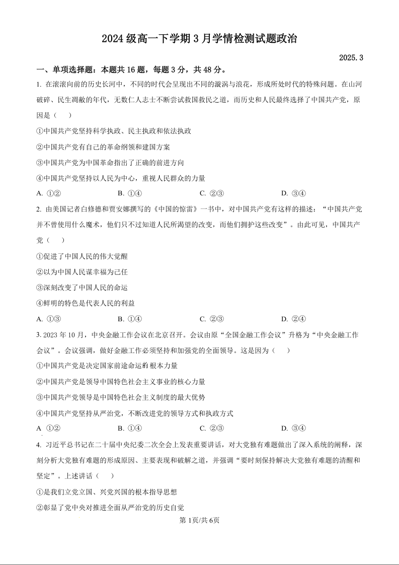 江苏省南京、镇江、徐州三市联盟校2024-2025学年下学期3月高一月考政治(原卷版)