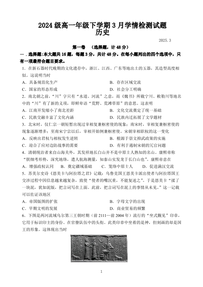 江苏省南京、镇江、徐州三市联盟校2024-2025学年下学期3月高一月考历史
