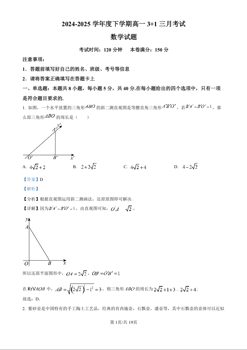 河北省保定市部分高中2024-2025学年下学期3月高一月考数学(精品解析版)