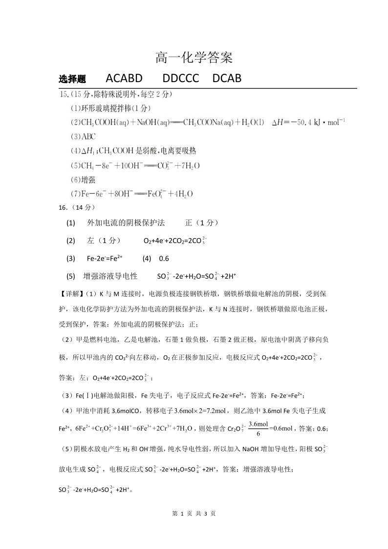河北省保定市部分高中2024-2025学年下学期3月高一月考化学答案