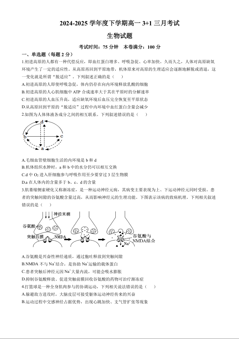 河北省保定市部分高中2024-2025学年下学期3月高一月考生物+答案