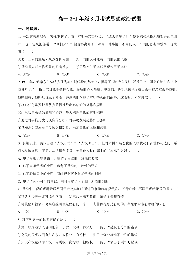 河北省保定市部分高中2024-2025学年下学期3月高一月考政治(原卷版)