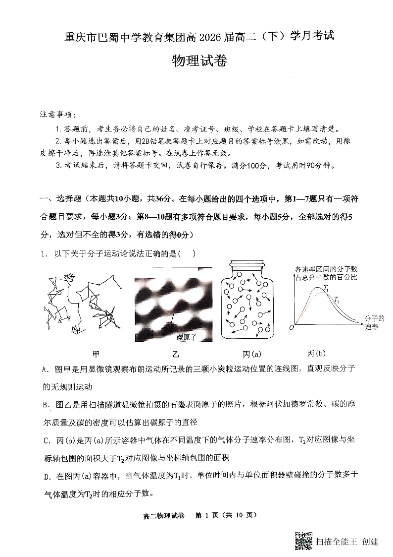 重庆市巴蜀中学2024-2025学年下学期3月高二月考物理