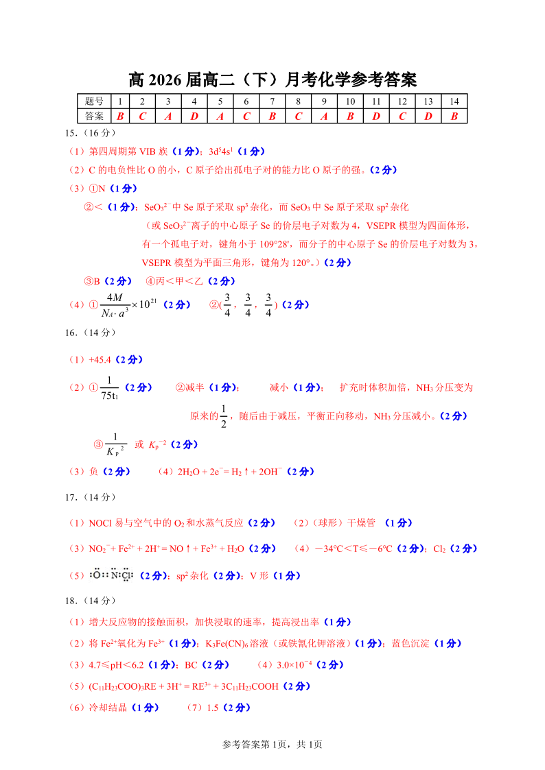 重庆市巴蜀中学2024-2025学年下学期3月高二月考化学答案