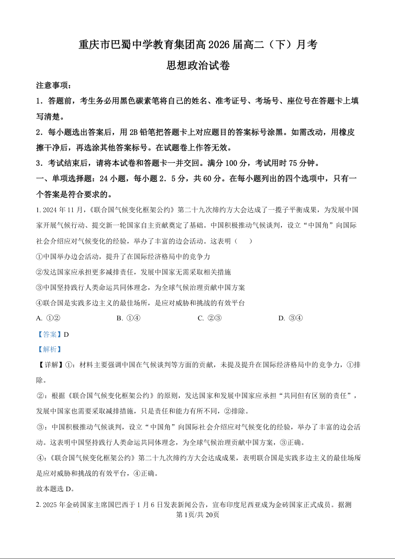 重庆市巴蜀中学2024-2025学年下学期3月高二月考政治(精品解析版)