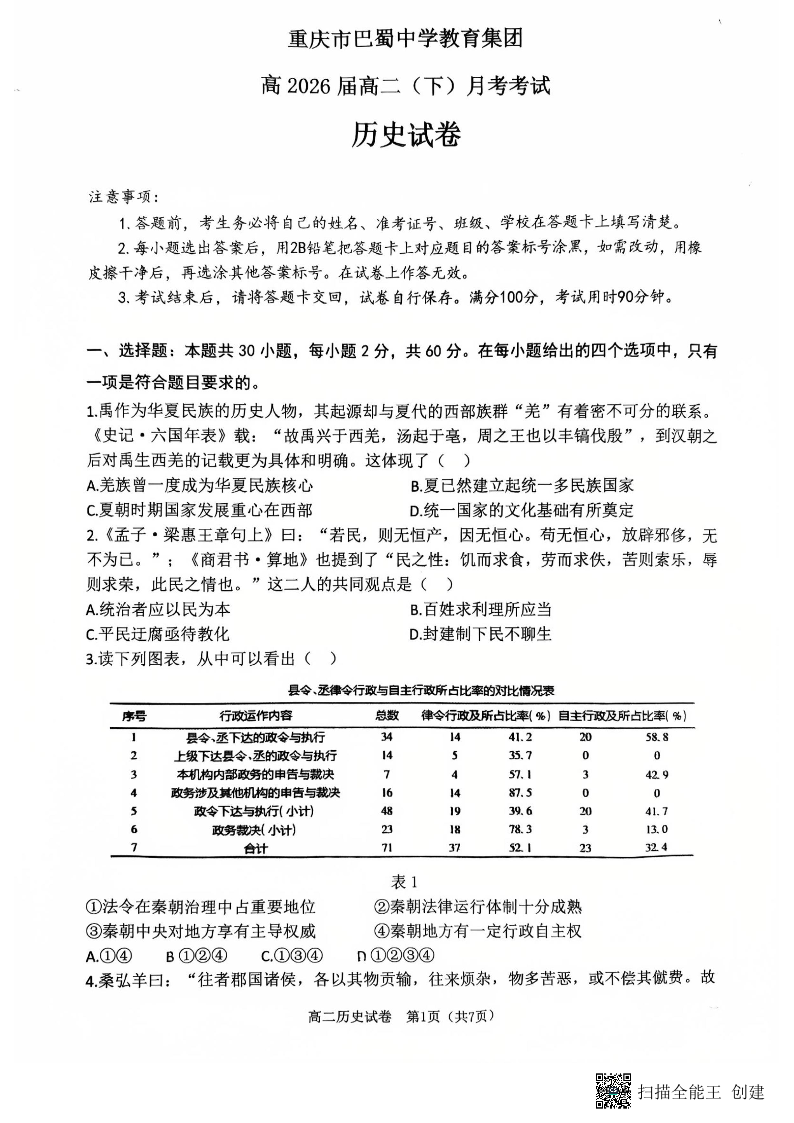 重庆市巴蜀中学2024-2025学年下学期3月高二月考历史