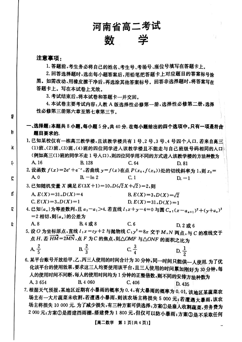 河南省安鹤新联盟2024-2025学年下学期3月高二联考数学
