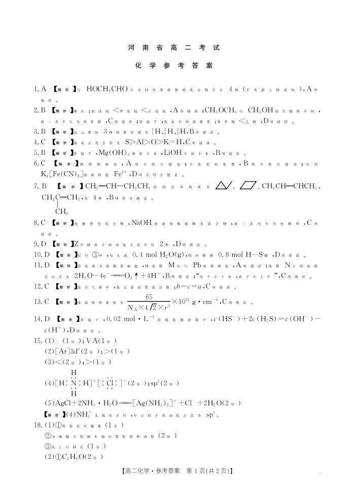 河南省安鹤新联盟2024-2025学年下学期3月高二联考化学答案
