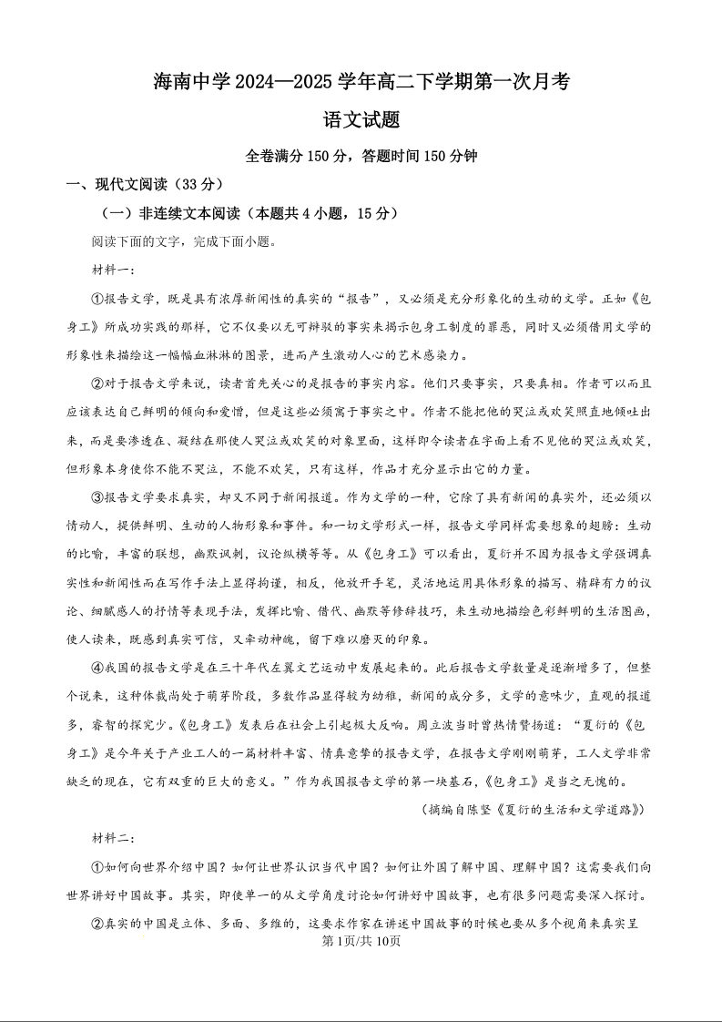 海南省海口市海南中学2024-2025学年下学期3月高二月考语文(原卷版)