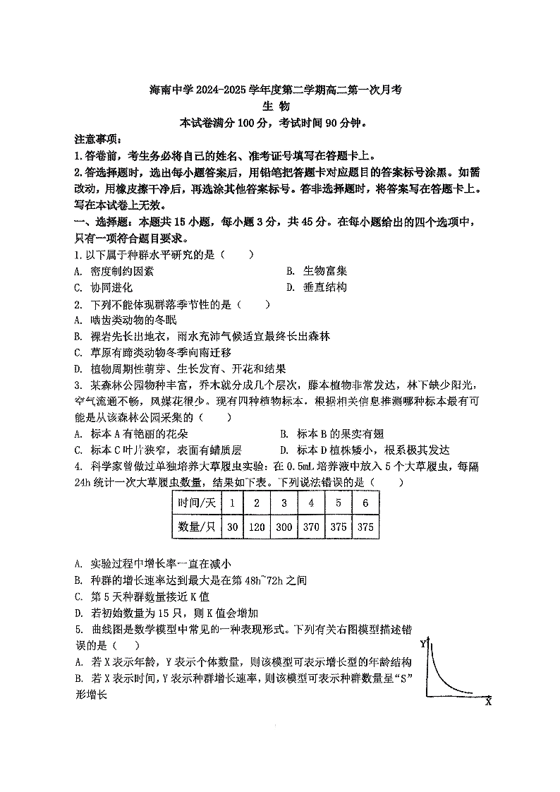海南省海口市海南中学2024-2025学年下学期3月高二月考生物