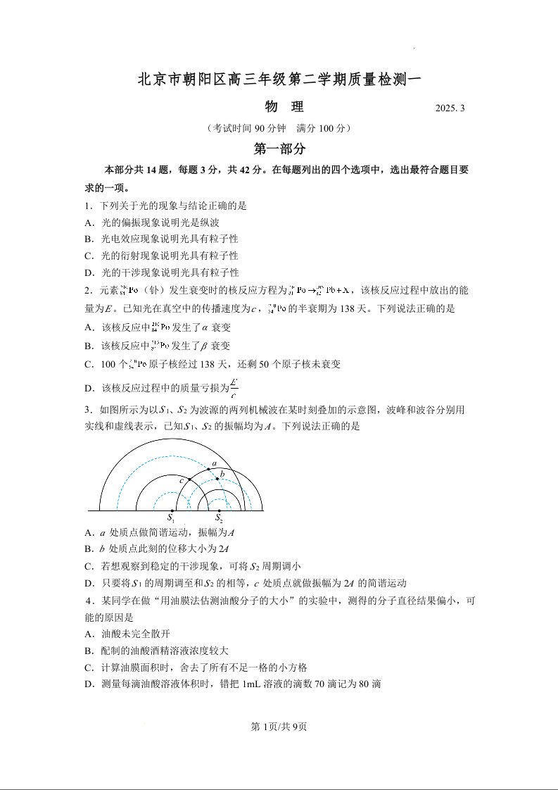 北京市朝阳区2025届高三年级第二学期3月质量检测一(朝阳一模)物理
