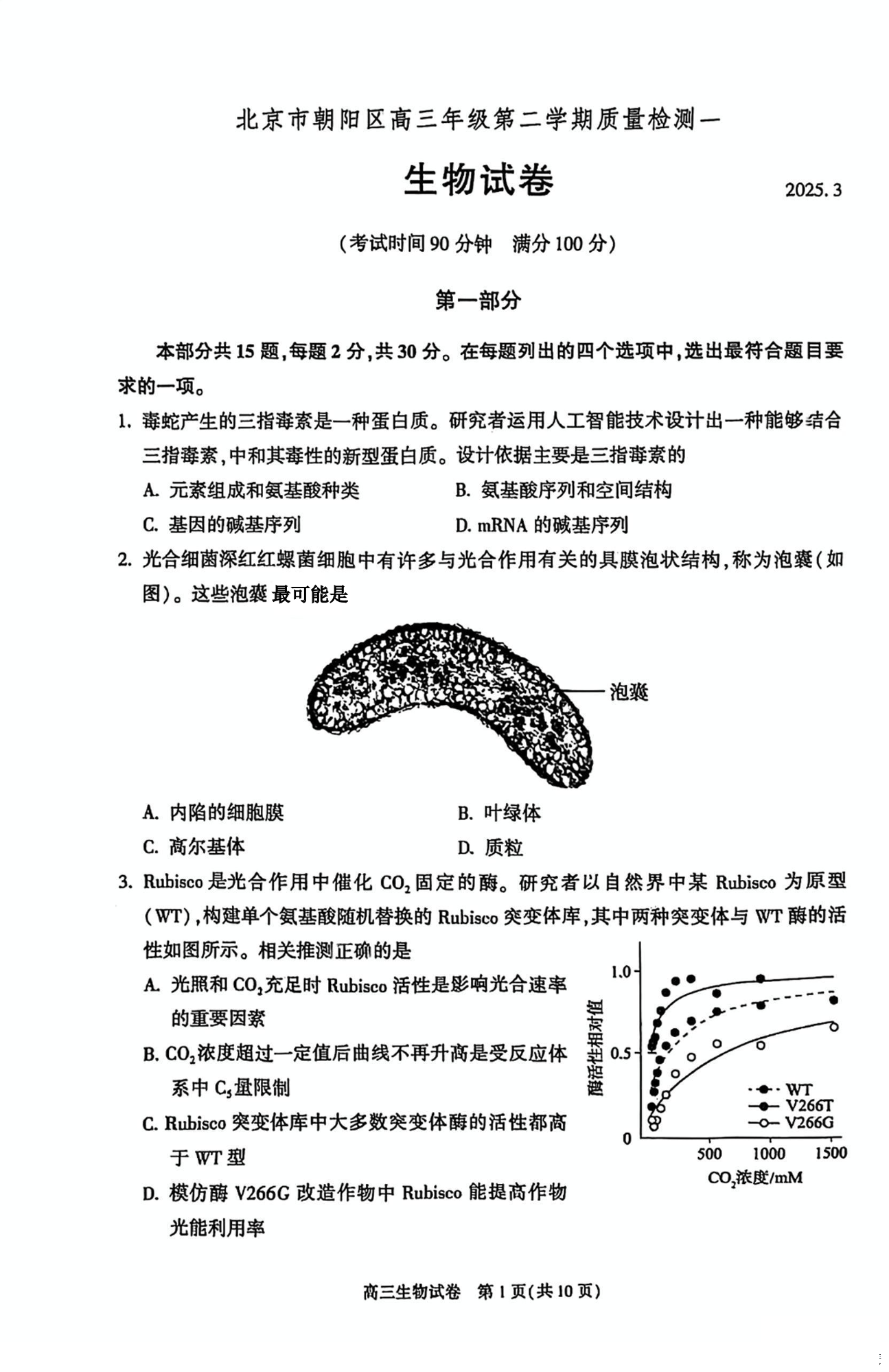 北京市朝阳区2025届高三年级第二学期3月质量检测一(朝阳一模)生物