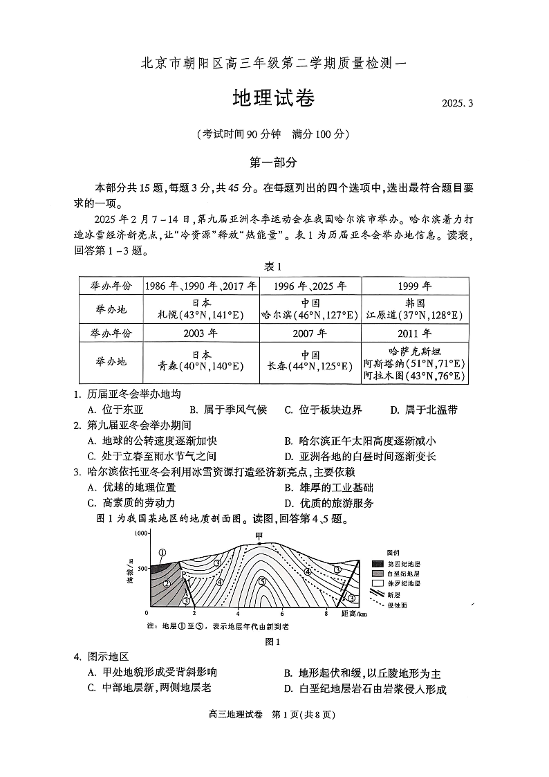 北京市朝阳区2025届高三年级第二学期3月质量检测一(朝阳一模)地理