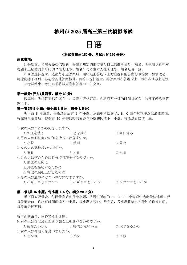 广西省柳州市2025届高三第三次模拟考试(柳州三模)日语+答案