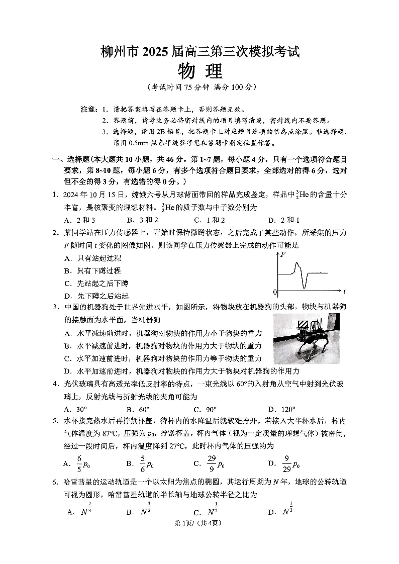 广西省柳州市2025届高三第三次模拟考试(柳州三模)物理+答案