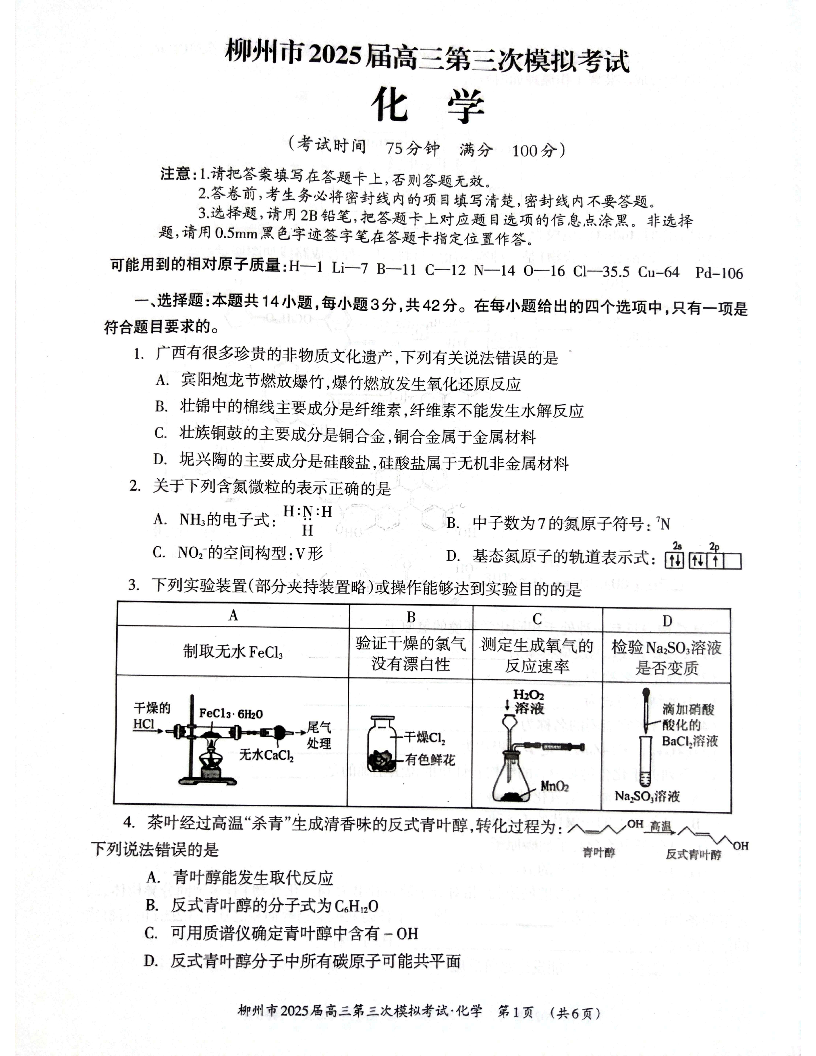 广西省柳州市2025届高三第三次模拟考试(柳州三模)化学+答案