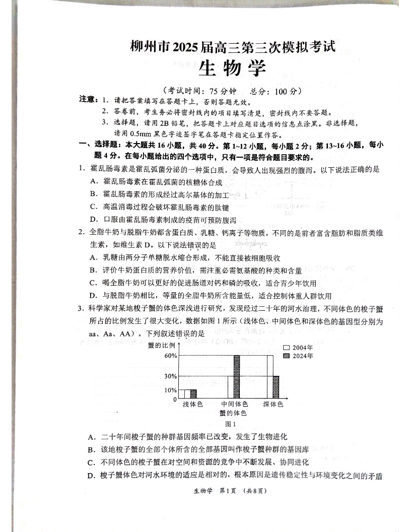 广西省柳州市2025届高三第三次模拟考试(柳州三模)生物+答案