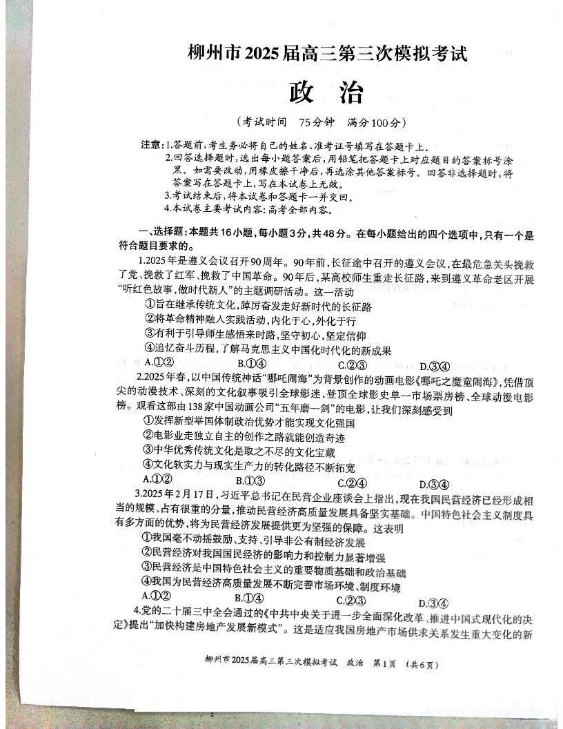 广西省柳州市2025届高三第三次模拟考试(柳州三模)政治+答案