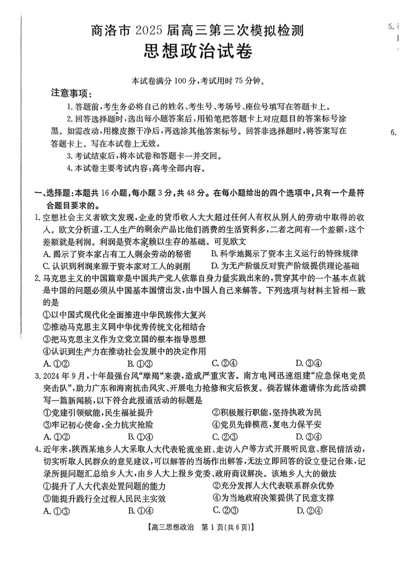 陕西省商洛市2025届高三第三次模拟检测(商洛三模)政治+答案