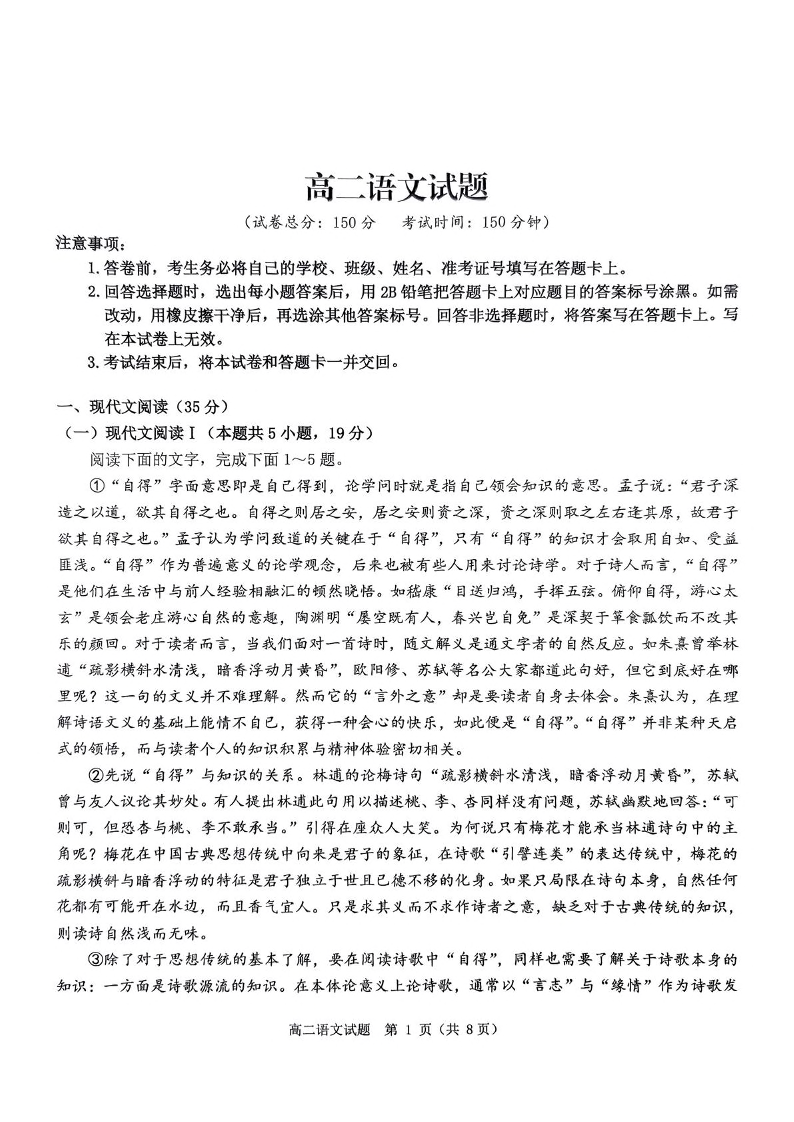 河南省驻马店市环际大联考2024-2025学年高二下学期阶段考试(一)语文+答案