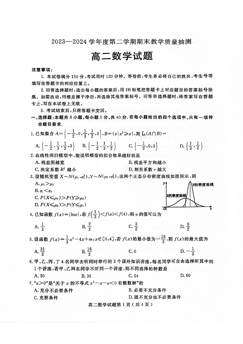 山东省聊城市高2025届下学期期末教学质量抽测考试数学