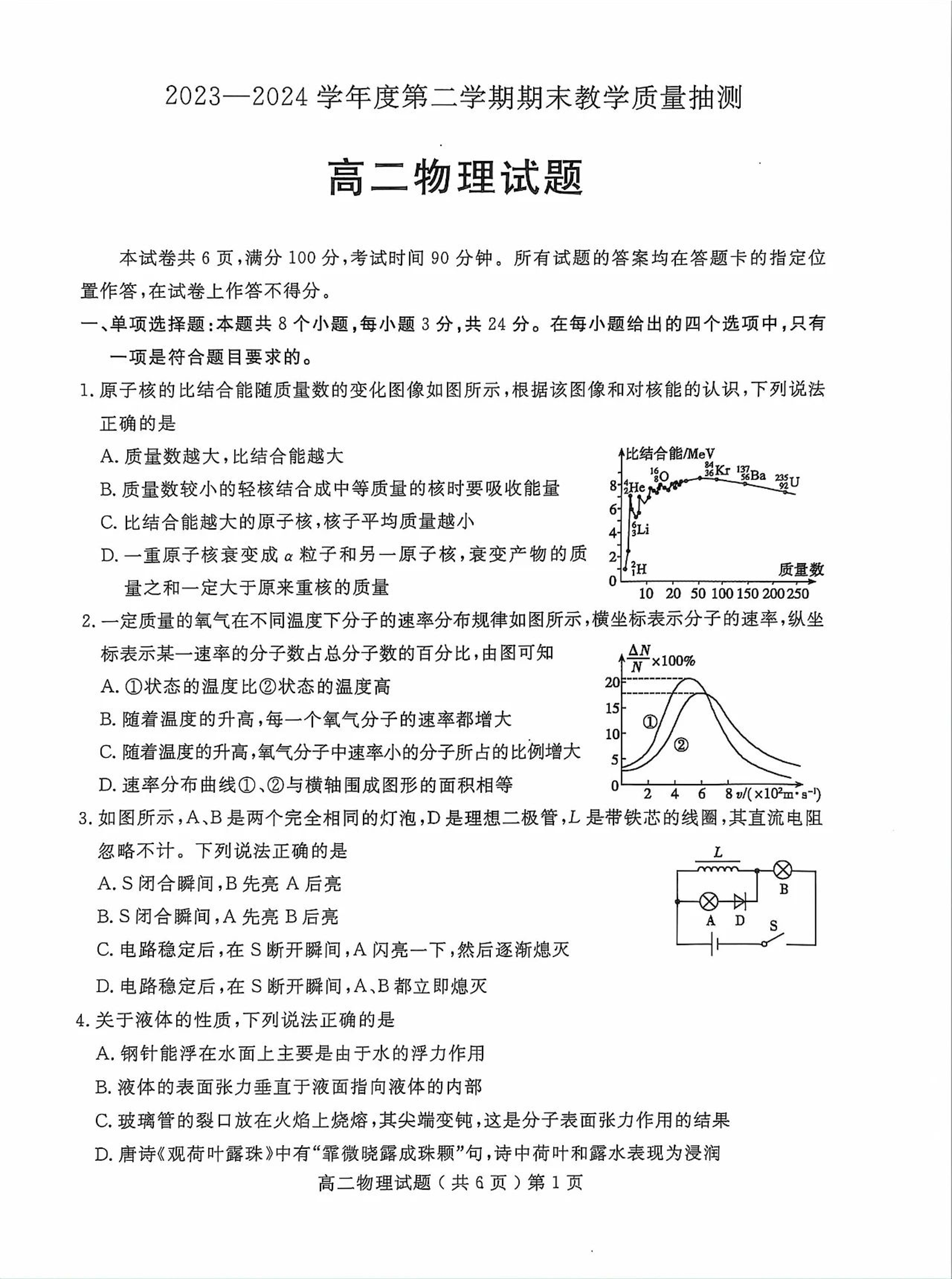 山东省聊城市高2025届下学期期末教学质量抽测考试物理