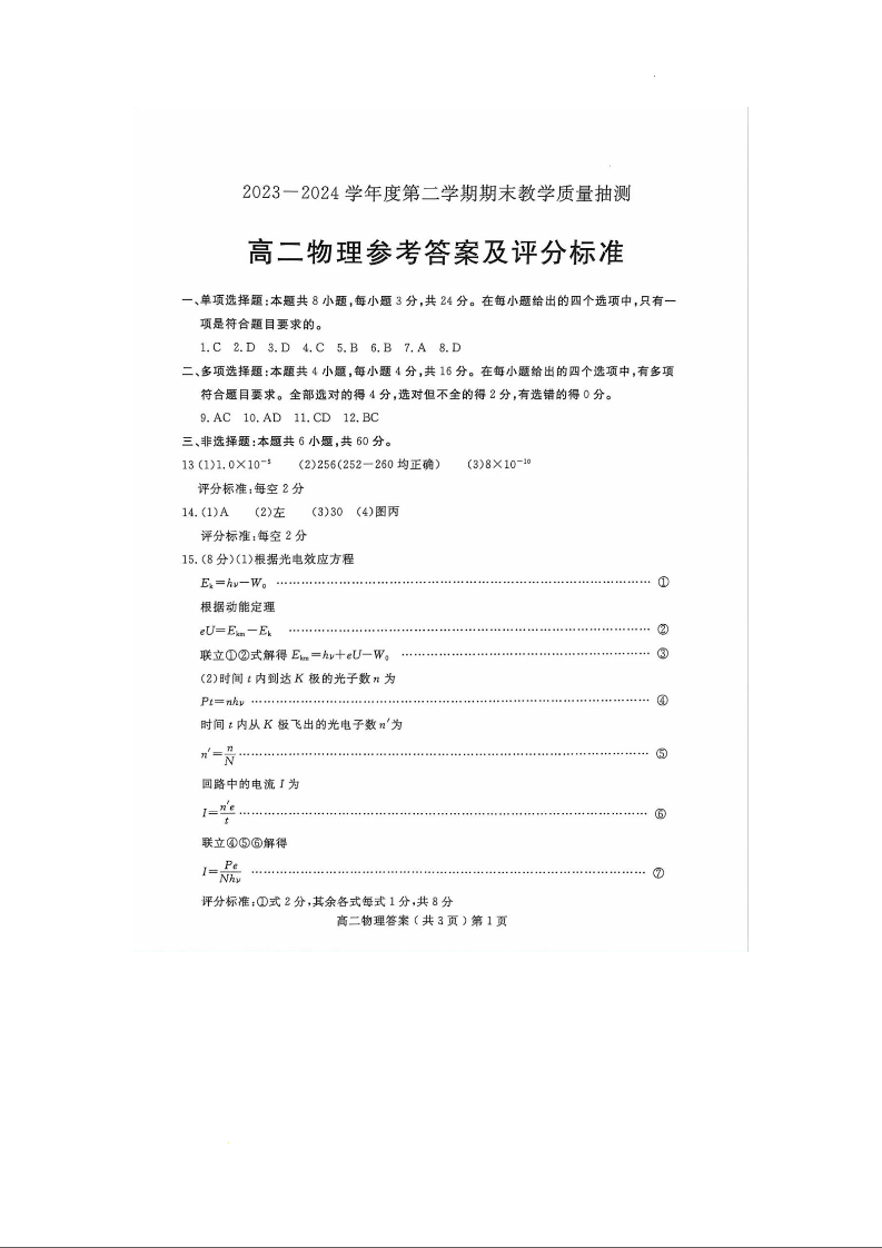 山东省聊城市高2025届下学期期末教学质量抽测考试物理答案