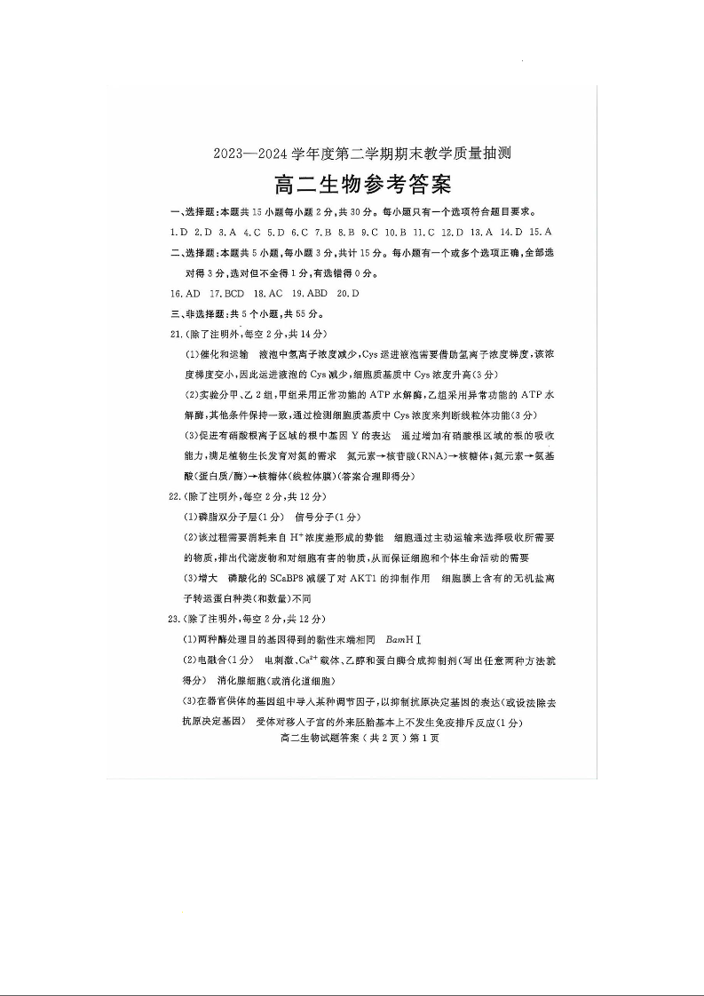 山东省聊城市高2025届下学期期末教学质量抽测考试生物答案