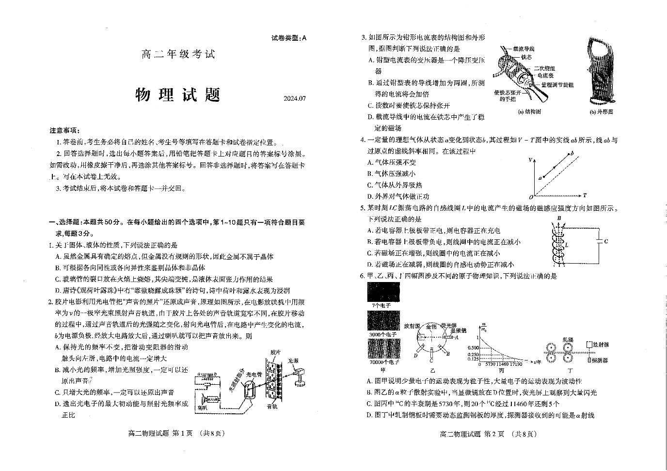 山东省泰安市高2025届下学期7月期末考试物理
