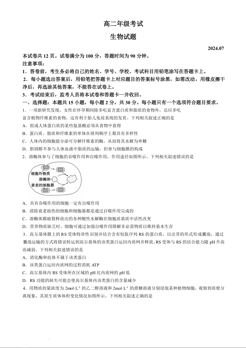 山东省泰安市高2025届下学期7月期末考试生物