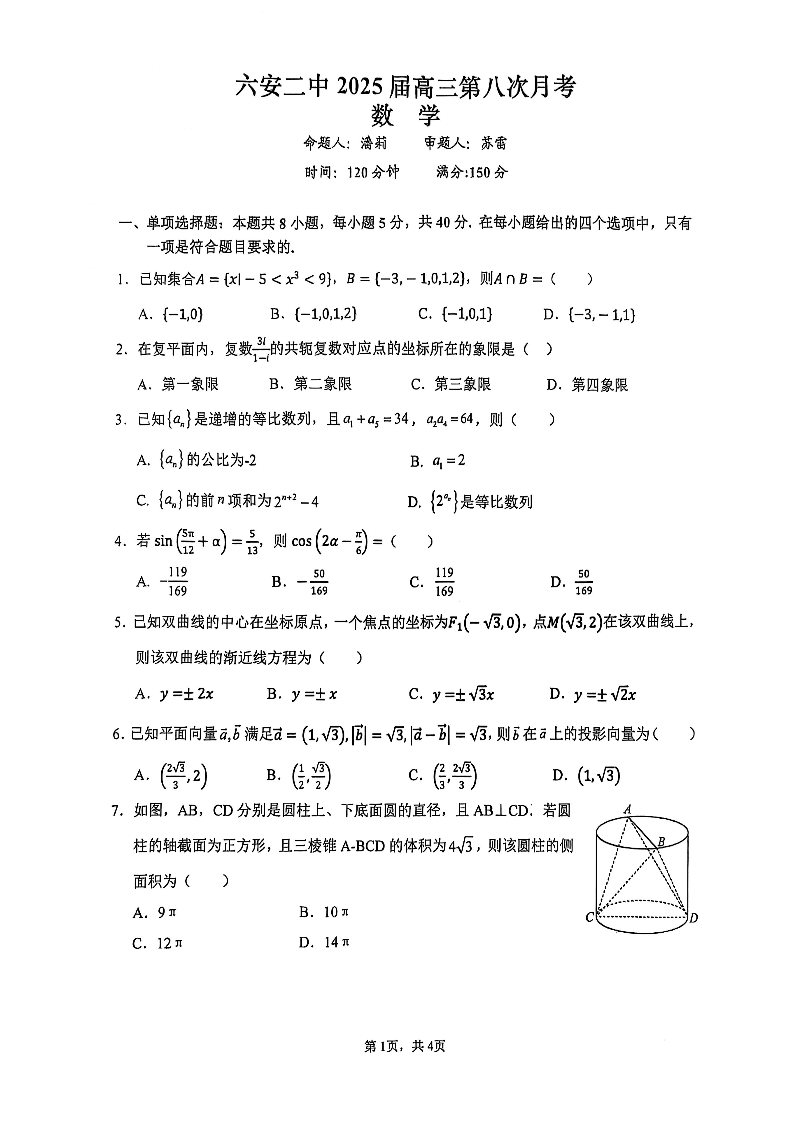 安徽省六安二中2025届高三下学期3月第八次月考数学+答案
