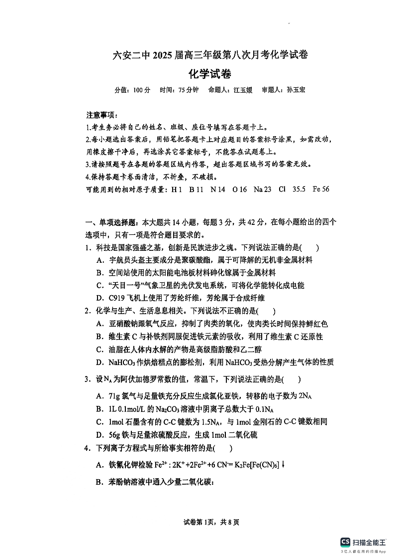 安徽省六安二中2025届高三下学期3月第八次月考化学+答案