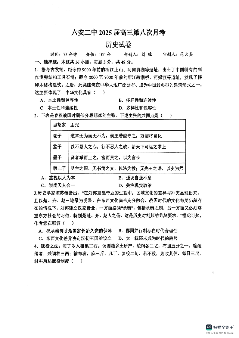 安徽省六安二中2025届高三下学期3月第八次月考历史+答案
