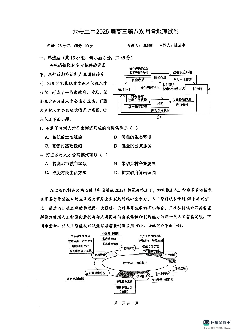安徽省六安二中2025届高三下学期3月第八次月考地理+答案