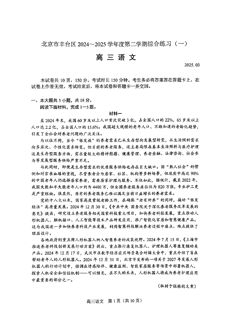 北京市丰台区2025届高三第二学期综合练习(一) (丰台一模)语文+答案