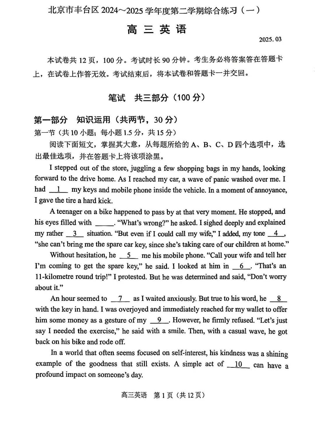 北京市丰台区2025届高三第二学期综合练习(一) (丰台一模)英语+答案