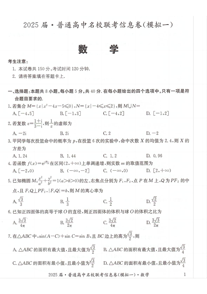 湖南省2025届普通高中名校联考信息卷(模拟一)数学