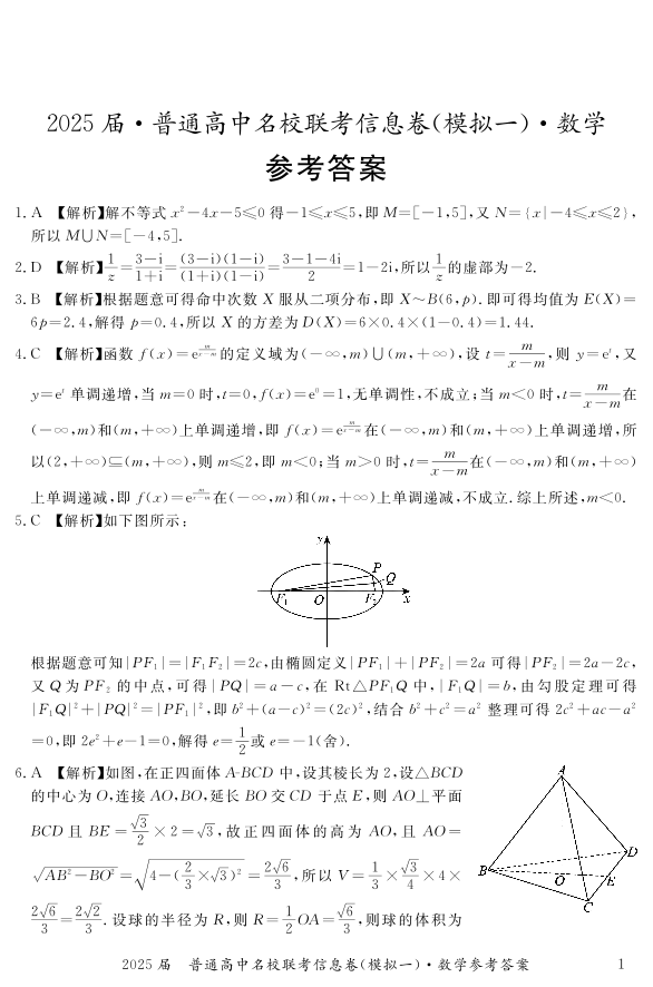 湖南省2025届普通高中名校联考信息卷(模拟一)数学答案