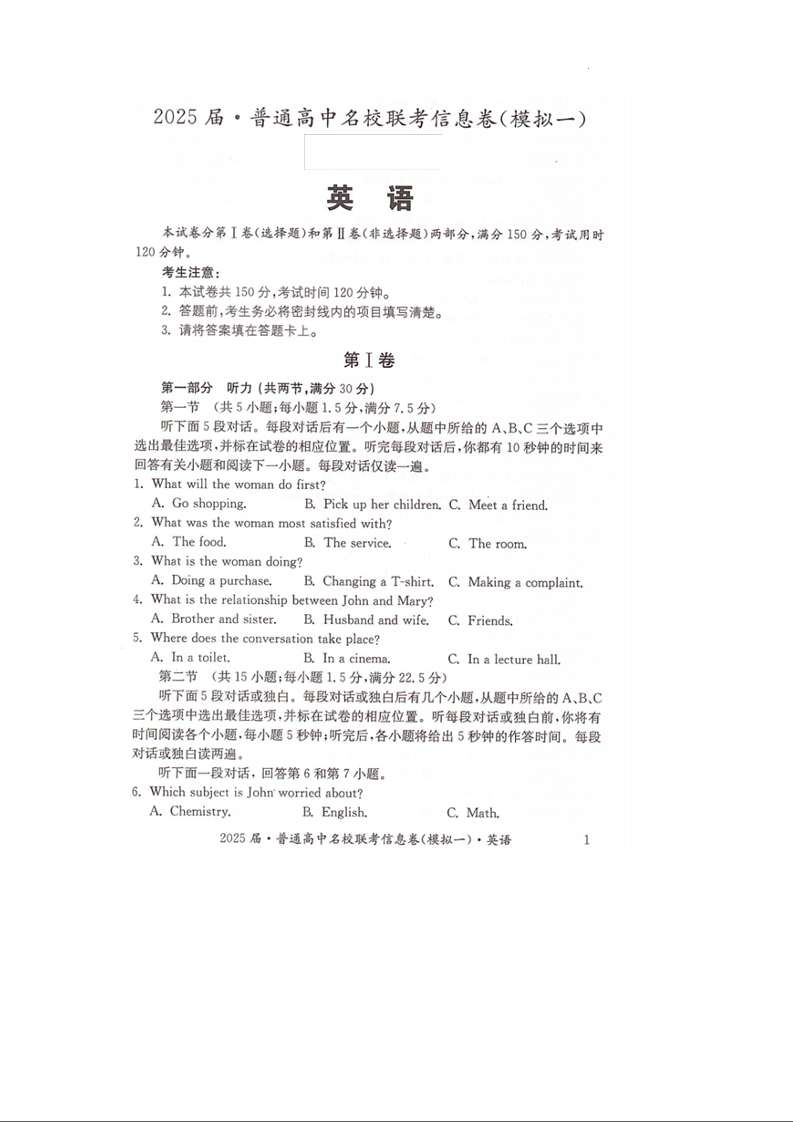 湖南省2025届普通高中名校联考信息卷(模拟一)英语