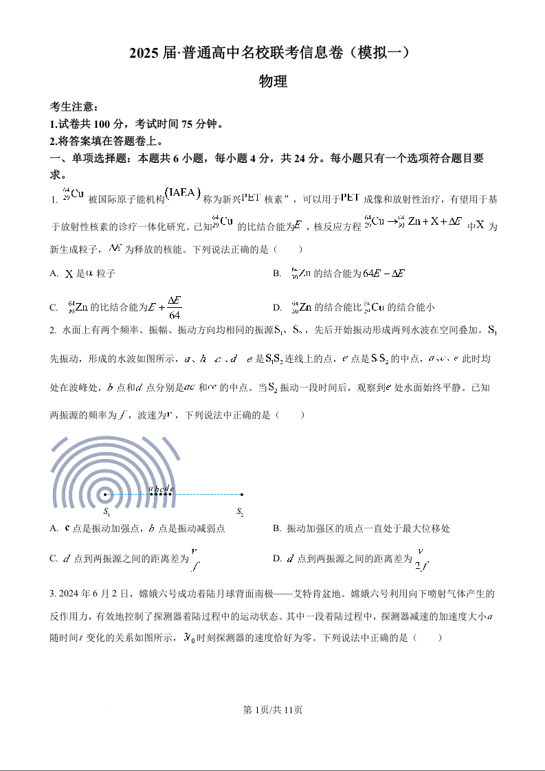 湖南省2025届普通高中名校联考信息卷(模拟一)物理+答案