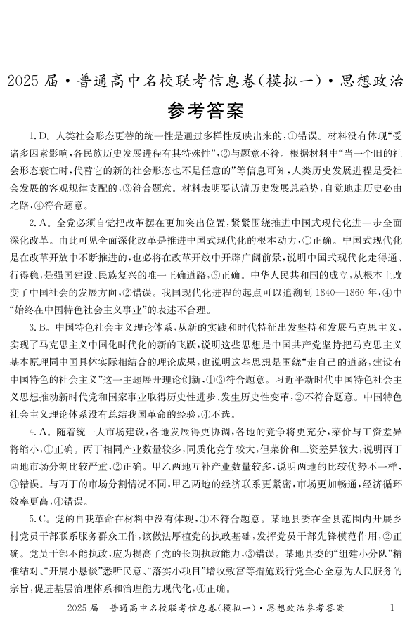 湖南省2025届普通高中名校联考信息卷(模拟一)政治答案