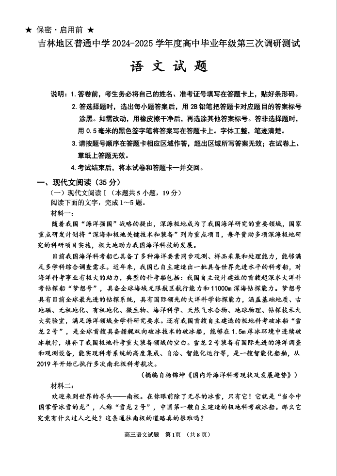 吉林省吉林市普通高中2025届高三第三次模拟测试(吉林三模)语文